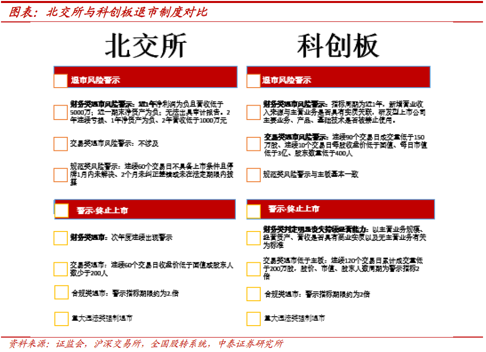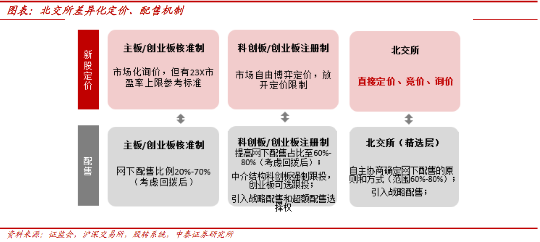 北京交易所的制度对比分析。1、定位的差异性:从新三板精选层上升至设立北交所,明确服务创新型中小企业,试点注册制,提升发行上市效率;2、发行制度的差异性:上市标准适用于中小市值企业,再融资制度对价格、规模不做行政干预,引入授权发行、储架发行,更适合中小企业;3、定价机制的差异性:延续精选层制度,保留直接定价、网上竞价、网下询价三种模式,更为灵活;4、交易制度的差异性:保留精选层30%涨跌幅限制,减持方面放宽对主要股东、实际控制人和董监高减持时间、数量的限制,改为预先披露要求;4、公司治理、信披制度、退市制度差异性:借鉴上市公司经验,凸显上市公司为信披和规范运营第一责任人,公司治理明确原则性要求基础上,鼓励“量力而行”,明确市场化退市制度安排,设置强制退市四类情形,有助于市场环境优化。5、制度后续展望:a.参考科创板、创业板,期待后续或对于红筹架构、存在表决权差异企业、上市公司子公司孙公司分拆上市等领域配套改革;b.投资者适当性具备优化空间。