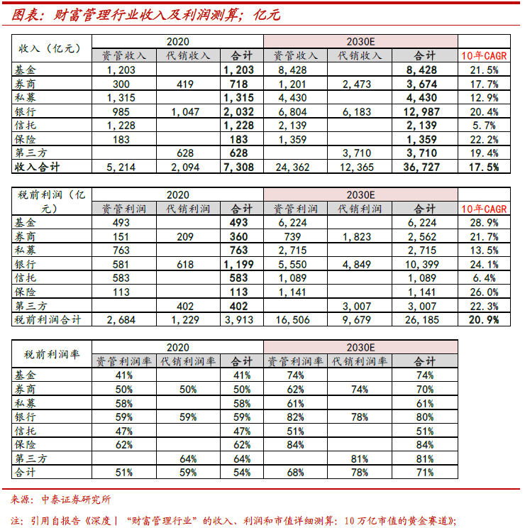 未来金融行业更看好财富管理业务发展。需求端的驱动因素来自居民财富持续增长,配置更多元,供给端的驱动因素则来自机构化趋势和金融科技运用。根据我们此前报告《深度丨“财富管理行业”的收入、利润和市值详细测算:10万亿市值的黄金赛道》的相关测算,我们预计未来10年至2030年,财富管理行业收入达3.67万亿(10年CAGR为17.5%),其中银行的财富管理收入达1.30万亿(10年CAGR为20.4%)。