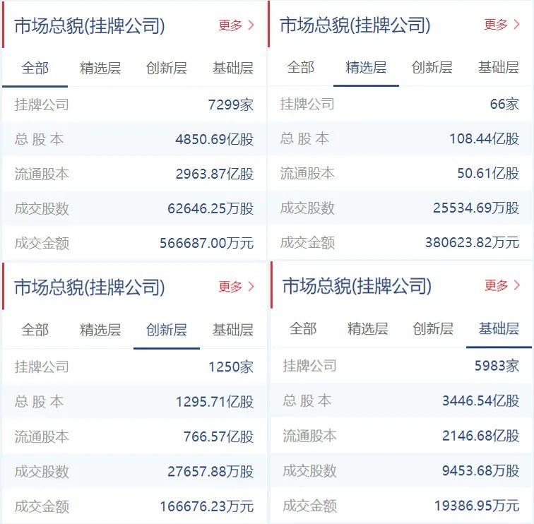 新三板挂牌公司总计7299家(精选层66家,创新层1250家,基础层5983家),总股本4850.69亿股,流通股本2963.87亿股。