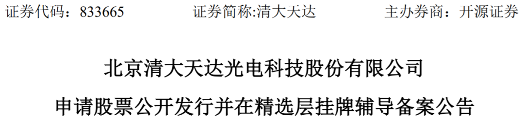 公告称,清大天达于2021年9月3日,向中北京证监局提交了向不特定合格投资者公开发行股票并在精选层挂牌的辅导备案材料,辅导机构为开源证券。