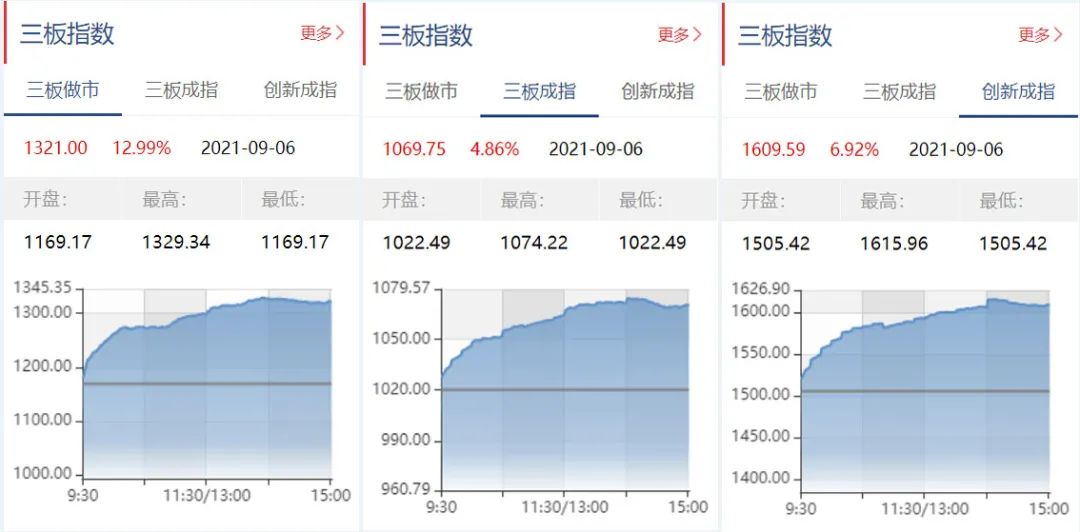 截至9月6日收盘,三板做市报1321.00点,下上涨12.99%;三板成指报1069.75点,上涨4.86%;三板创新报1609.59点,上涨6.92%。
