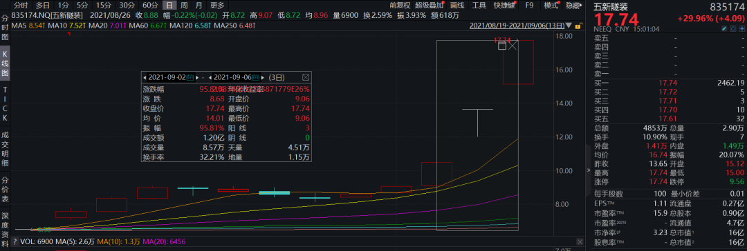 值得一提的是,五新隧装今日一度涨30%涨停,最终收涨29.98%。三个交易日累计涨幅达到95%,接近翻倍。