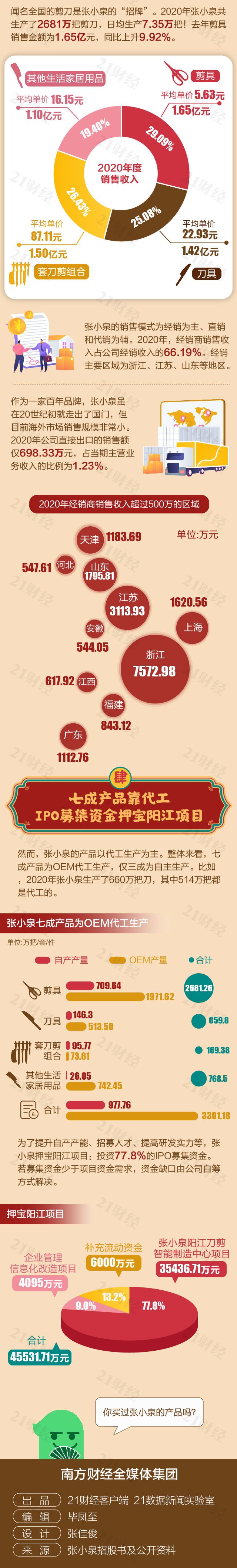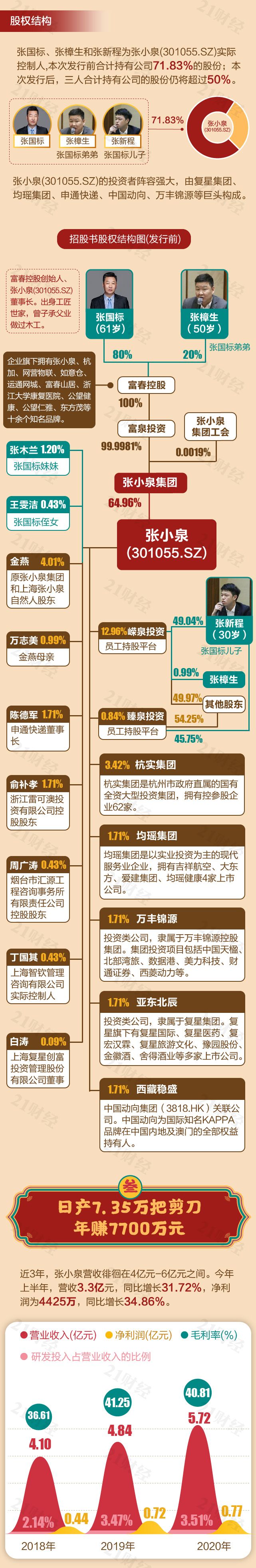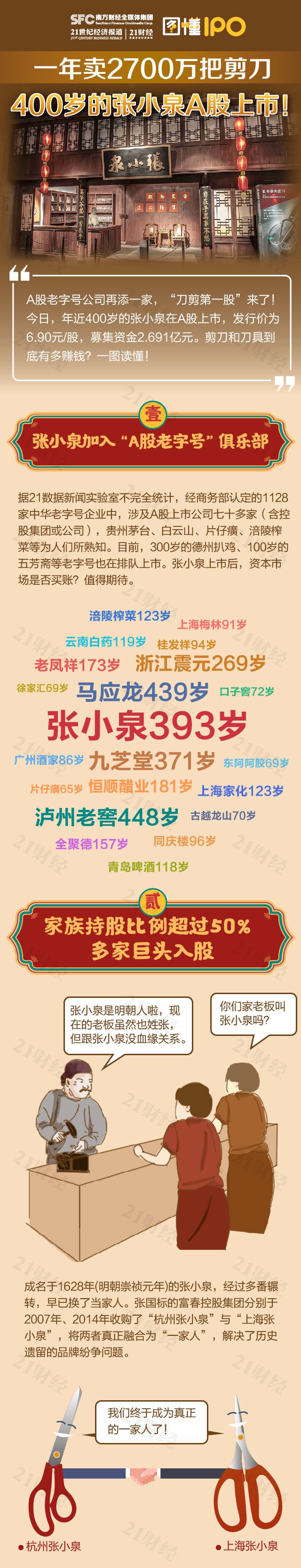 今日,年近400岁的张小泉在A股上市,发行价为6.90元/股,募集资金2.691亿元。