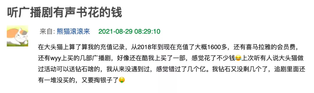 “有的广播剧长达4-5季,买断整部要花上百元,比原著都贵,能同时充几个视频网站的会员了,还不能分集购买及时止损,这不合理。”黄圆质疑,“总有人说‘只是一杯奶茶钱’,但如果我每天都想喝奶茶,为什么要为了买一部可能踩雷的剧而降低日常幸福感呢?”