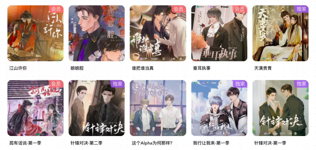 比如去年10月,漫播一上线就接连拿出了知名耽美小说《针锋对决》《含桃》等多部广播剧,很快在圈内积攒了人气。很快成长为与猫耳FM齐名的平台,尽管两者上线相隔多达10年。