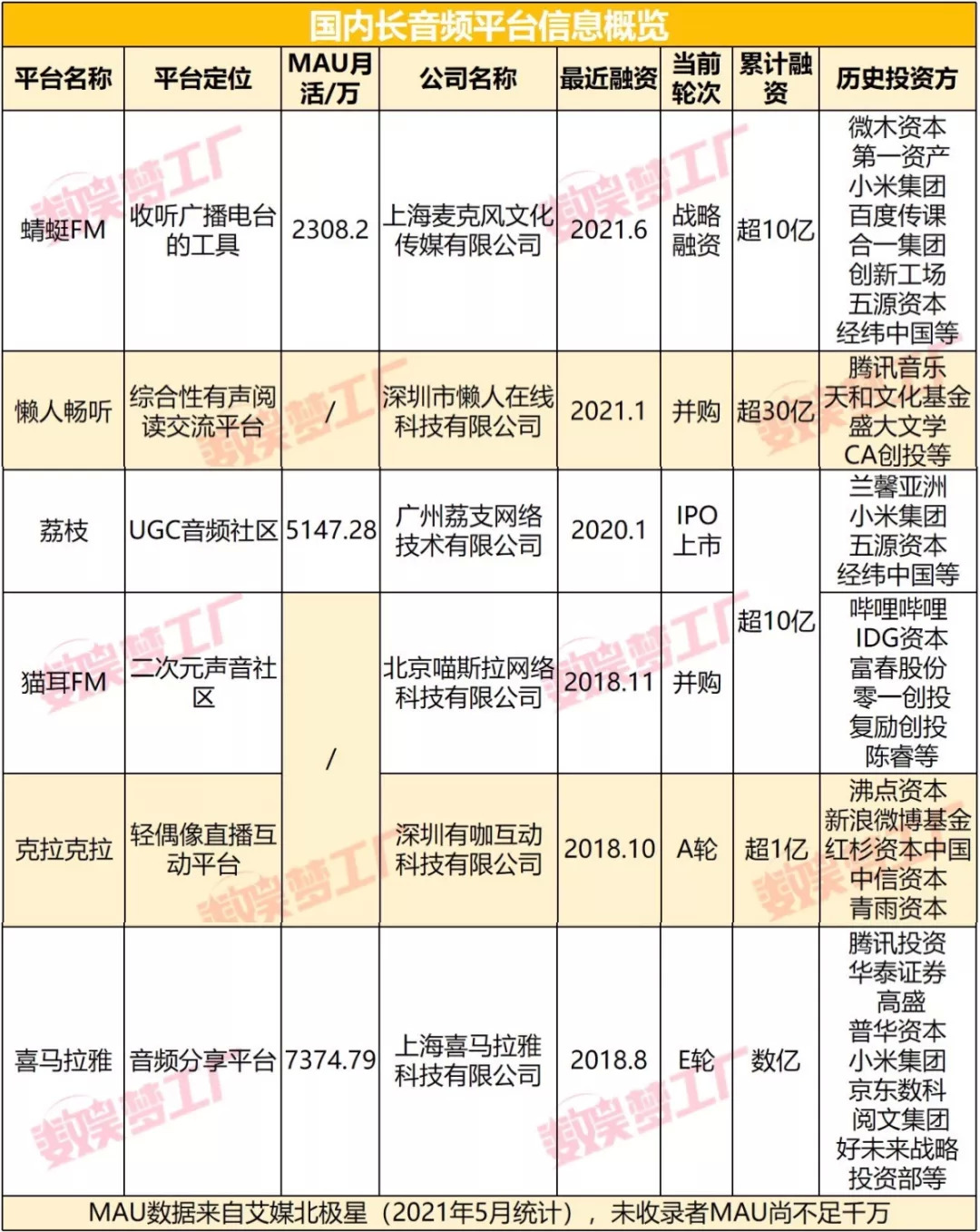 数娱君梳理在线音频平台融资历史发现,无论是月活不足千万、以直播互动和广播剧为主的克拉克拉,还是定位二次元声音社区的猫耳FM,最近几年都备受资本青睐,单次融资都在亿元以上。