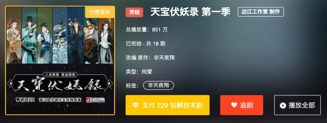 截止今年9月4日,《天宝伏妖录》第一季总播放量为851万,后三季均低于这个数。虽然这类玄幻题材的剧后期费用会明显高于普通的校园甜宠剧,但不难推测:一部广播剧想要回本,单季播放量破千万可能才算稳妥。