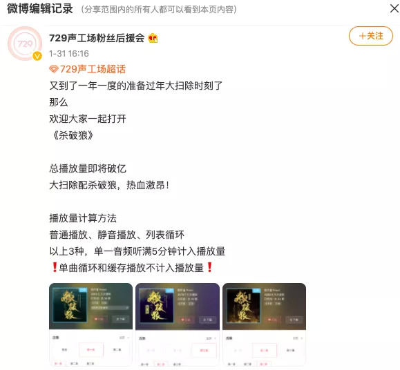 在此基础上,前台播放数据的可信度也需要留意。今年年初,729声工场粉丝后援会在为广播剧《杀破狼》打榜期间,无意透露猫耳FM后台播放量统计规则。也就是说,一些看似播放数据喜人的广播剧,多少掺杂了粉丝打开免费试听剧集“刷量”的努力。