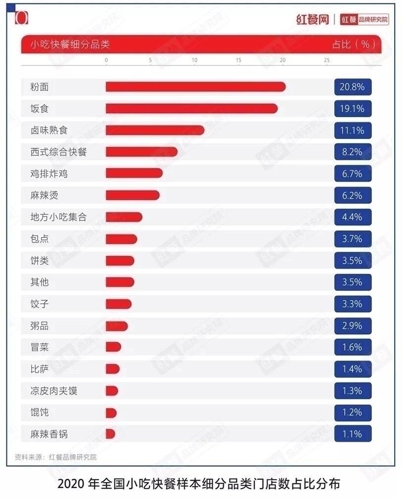 实际上,获得融资的面馆不过是整个面品类三千弱水下的一瓢饮而已。《中国餐饮品类与品牌发展报告2021》数据显示,2020年全国小吃快餐细分品类中,粉面的门店数占比还略高于饭食,达到了20.8%。