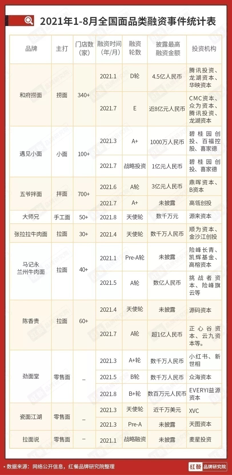 2021年前8个月,面品类迎来了近20轮融资,整个面品类俨然成为了资本竞相追逐的香饽饽。