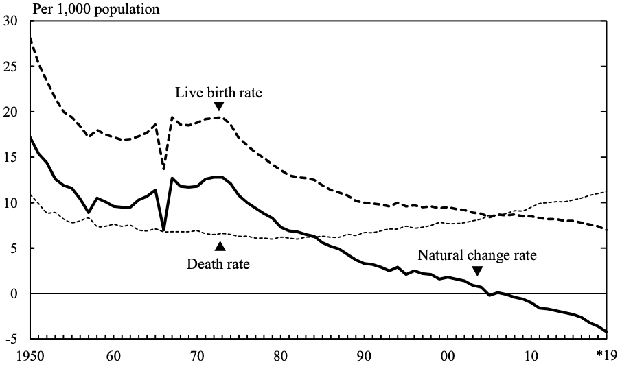 在 1971 年至 1973 年的第二次婴儿潮期间,活产率(每 1,000 人)处于 19 的水平。自 1970 年代后期以来,继续下跌。2019 年的比率为 7.0。 活产率下降率可能部分归因于产妇分娩年龄的上升。2019年,母亲第一次生育的平均年龄从 1970 年的 25.6 岁上升到 30.7 岁,总和生育率跌破2.00后呈下降趋势。1975 年,并在 2005 年达到了 1.26 的历史低点。之后恢复增加。但总和生育率连续 4 年下降,2019 年降至 1.36。1975 年间死亡率(每 1,000 人)稳定在 6.0 - 6.3。并自 1988 年以来一直保持上升趋势,反映了老龄化的人口,2019 年达到 11.2。