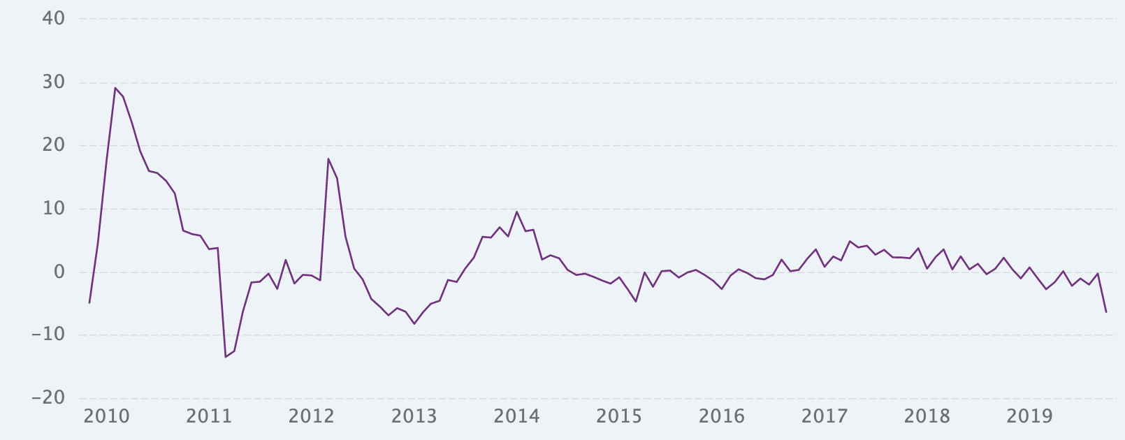 二是日本国内投资需求仍将较为稳定。在私人投资方面,由于净利润呈稳中有升态势,日本企业可期加快更新老旧设备速度,同时为了应对人口老龄化,无人工厂方面的投资有望不断扩大。2019年10月,日本国会对《外汇管理法》进行了修改,大幅放松了对财务投资者的管制。在全球避险情绪高涨的大背景下,更加宽松的投资管理政策为日本企业创造了成本更低的融资环境。