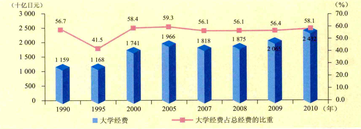 二十年来,随着日本大学数量不断增加,国立大学和私立大学的办学经费也有很大提高。1995年到2000年间,大学经费增加49%,而2010年与1990 年相比,大学经费增加17.8%。2000年以前大学经费增加较快,之后增长速度明显放慢。大学经费的增加可以使得学校从校舍到教师,从硬件到软件都有所改观,可以促进教学质量的进一-步提高。