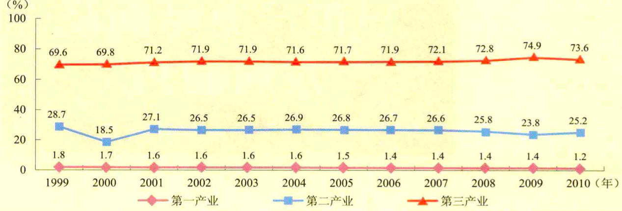 日本产业结构已发展到较高水平,当前第三产业所占国民经济比重约占四分之三,而第一产业仅占微小比重并呈小幅下降趋势,第二产业比重受东南亚金融危机波动之后维持在四分之一左右。三大产业结构趋于成熟,比重的进一步变化将有待新产业增长点的出现。