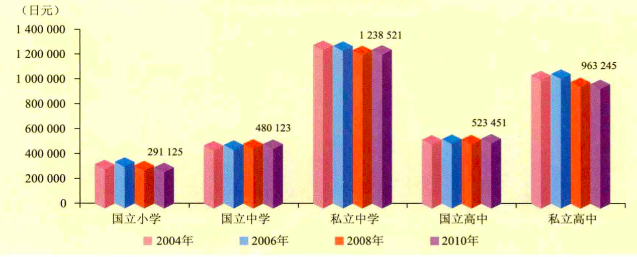 日本小学实行义务教育,因此没有私立小学,而中学、高中及大学则区分为国立和私立。从数据来看,小学和私立中学、私立高中的学生年均学习费用支出呈现轻微下降趋势,而国立中学和国立高中的学生年均学习费用支出则有所上升。