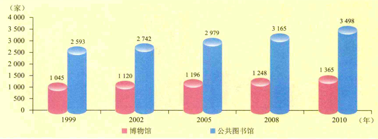 伴随着经济不断发展、社会不断进步,日本在文化产业上也快速发展。十年来日本的博物馆和公共图书馆的数量都呈现稳步上升趋势。其中2010年与1999年相比,博物馆增加30.6%,而公共图书馆增加了34.9%。可见国家在文化领域加大了投资,丰富了人们的生活,开阔了大家的视野。