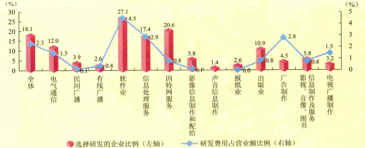在模块与数字化时代,研发是最有利的竞争武器,为保持技术优势,日本有众多企业参与到信息通信产业的研发当中。软件业选择研发的企业比例以及研发费用占营业额比例都是最高的,这也基本上与前面的利润额及就业人数等指标相吻合,信息处理业也明显具有这一特征。相反,报纸、广播等传统服务业进行研发的企业及费用比例都相对较低。