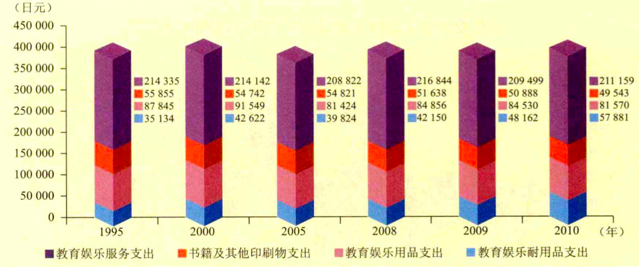 近二十年来,日本各家庭的教育娱乐支出呈现稳步上涨趋势。从总额来看,2010 年教育娱乐支出总额400153 日元,比1995年增加2%。教育娱乐服务支出占总支出额的50%,教育娱乐用品支出的比重居其次。从总体上看,近年来日本的教育娱乐支出变化相对缓慢,究其原因主要是经济的萧条影响了教育娱乐支出的增长。
