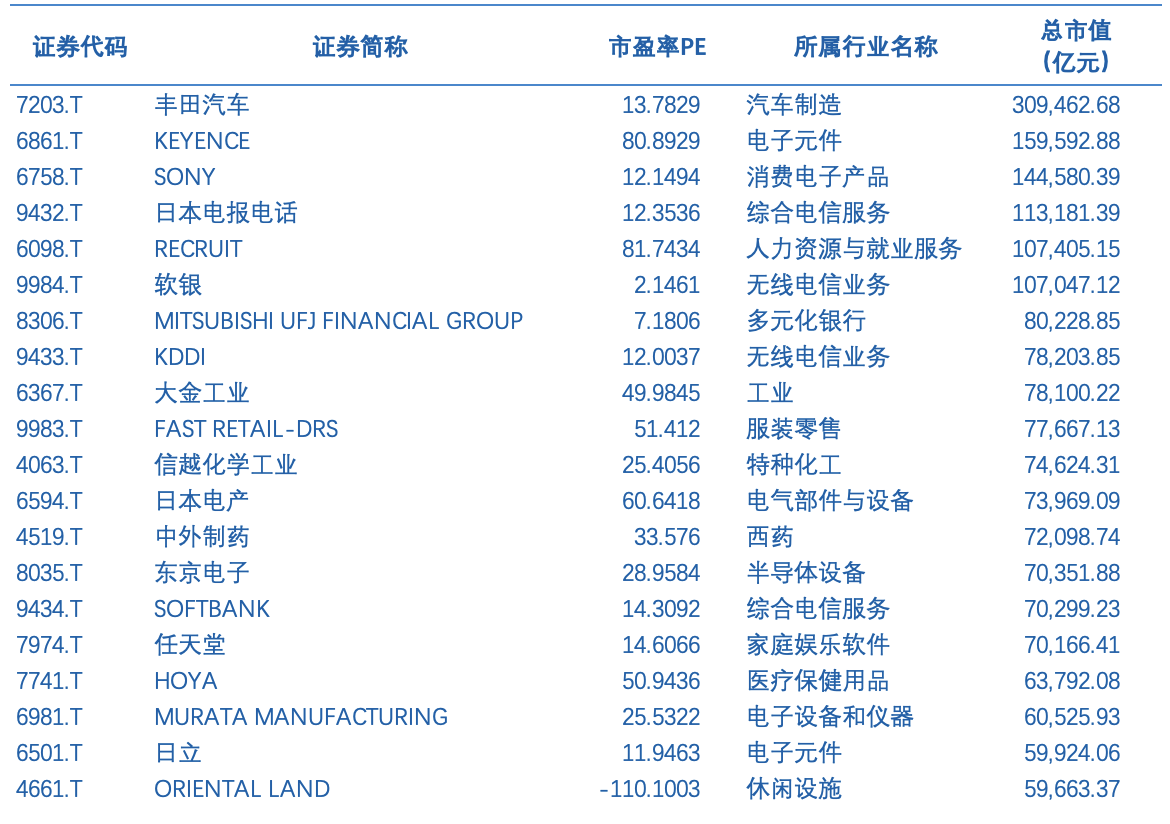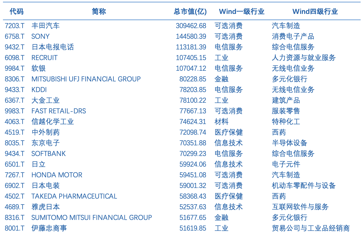 图:日经225指数上市公司成分行业分布(按上市公司市值分类)