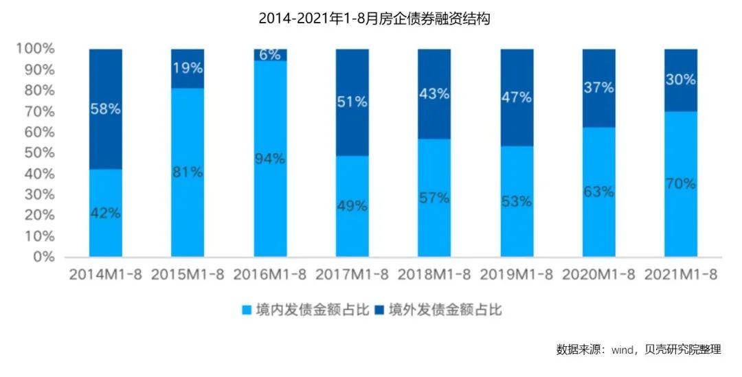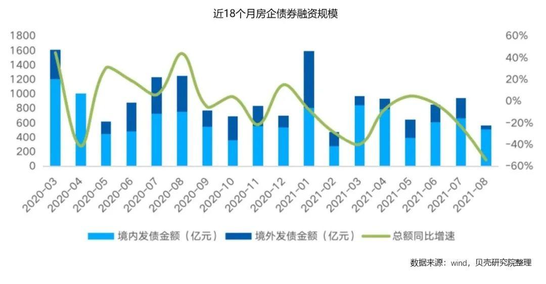 根据贝壳研究院统计,2021年1-8月房企境内外债券融资累计约6999亿元,较2020年同比下降21%,金额规模减少1817亿元。前8月累计增速较前7月加速下滑,2021年1-8月发债规模占比2020年全年约58%。