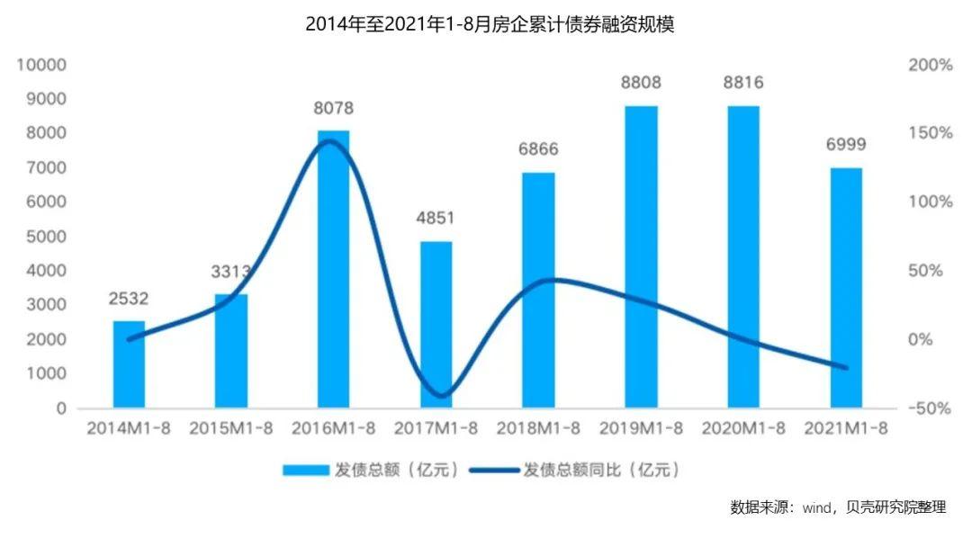 1、整体规模:2021年1-8月房企累计发债6999亿元,同比下降21%