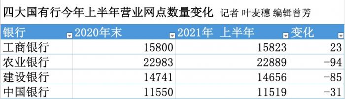 21世纪经济报道记者 叶麦穗 广州报道 银行网点收缩大势所趋。目前银行半年报已经全部披露完毕,工、农、中、建四大行的半年报数据显示,上半年合计减少187家网点或机构,而去年全年四大行合计减少370家,以上述数据来看,今年全年网点减少数量逼平或者超过去年全年是大势所趋。