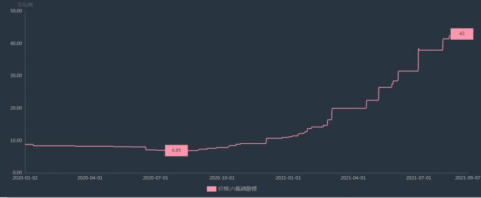 数据显示,碳酸锂7月初价格为8.8万元/吨,最新价格已涨至12.7万元/吨,同期六氟磷酸锂跟随上调,从7月初的38.5万元/吨涨至当前的43万元/吨。