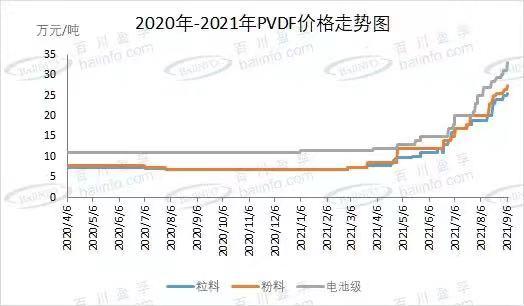 直至9月6日,该产品涨势仍未结束。百川盈孚数据显示,当日电池级PVDF已升至31-34万元/吨,而在今年3月其价格尚不过10万元出头。