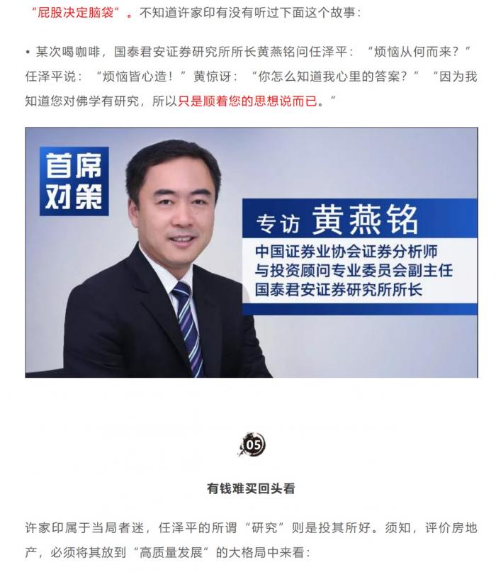 刘胜军称,像许家印这样大胆的企业家,缺的不是胆量,而是理性。而任泽平最大的特点就是“煽情”、“忽悠”、“见风就是雨”(任泽平其实不牛,只是他很会吹牛)。干柴遇到烈火,结果可想而知。