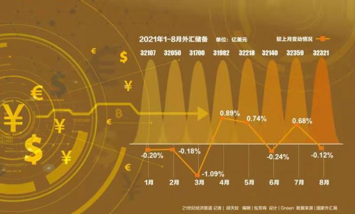 9月7日,国家外汇管理局公布最新外汇储备数据显示,截至2021年8月末,中国国内外汇储备规模为32321.16亿美元,较7月末下降37.74亿美元,降幅为0.12%。