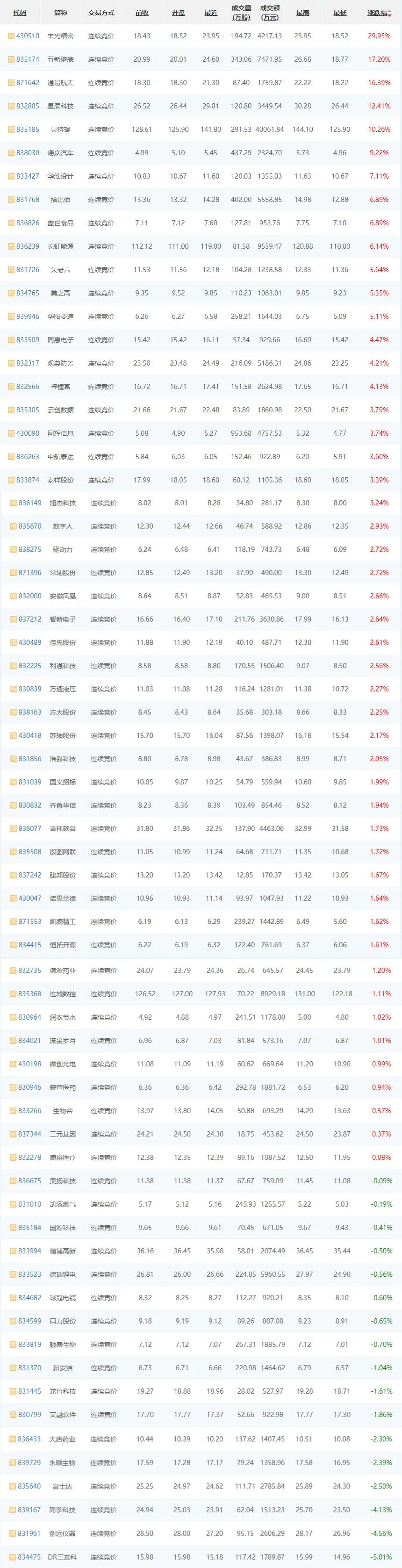 9月7日,精选层普涨,49家企业上涨,17家下跌。其中,丰光精密(430510)涨幅居首,上涨29.95%;五新隧装(835174)居次上涨17.20%;三友科技(834475)跌幅居首,下跌5.01%;创远仪器(831961)居次下跌4.56%。
