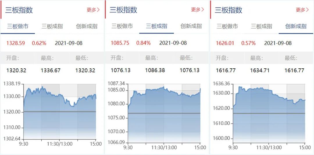 截至9月8日收盘,三板做市报1328.59点,上涨0.62%;三板成指报1085.75点,上涨0.84%;三板创新报1626.01点,上涨0.57%。