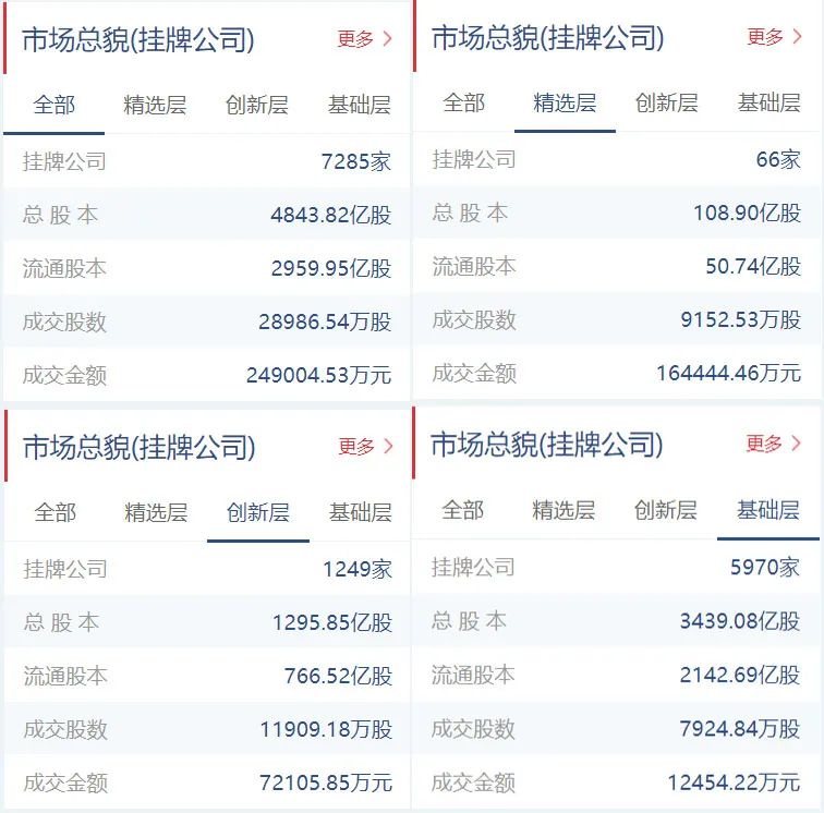 新三板挂牌公司总计7285家(精选层66家,创新层1249家,基础层5970家),总股本4843.82亿股,流通股本2959.95亿股。