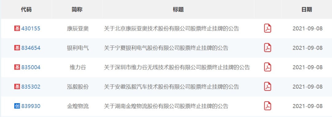 9月8日,新三板创新层公司金煌物流(839930)及基础层公司泓毅股份(835302)、维力谷(835004)、银利电气(834654)、康辰亚奥(430155)终止挂牌。