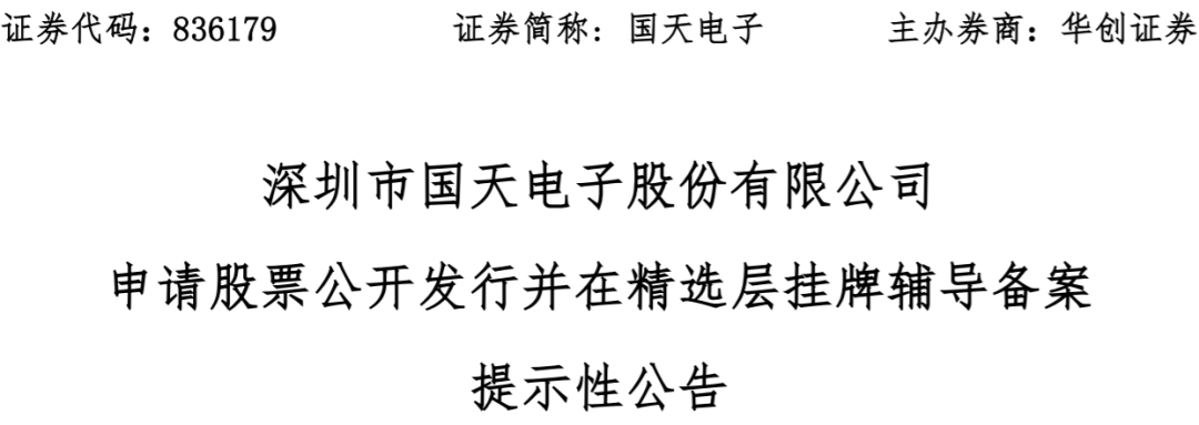 国天电子于近期向深圳证监局提交了向不特定合格投资者公开发行股票并在精选层挂牌辅导备案登记材料并于2021年9月7日获得受理,辅导机构为华创证券。