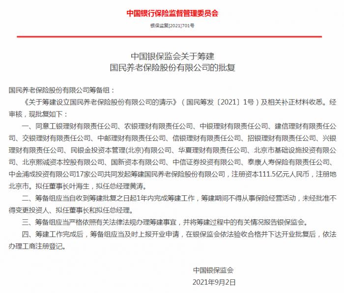 银保监会批复筹建国民养老保险股份有限公司