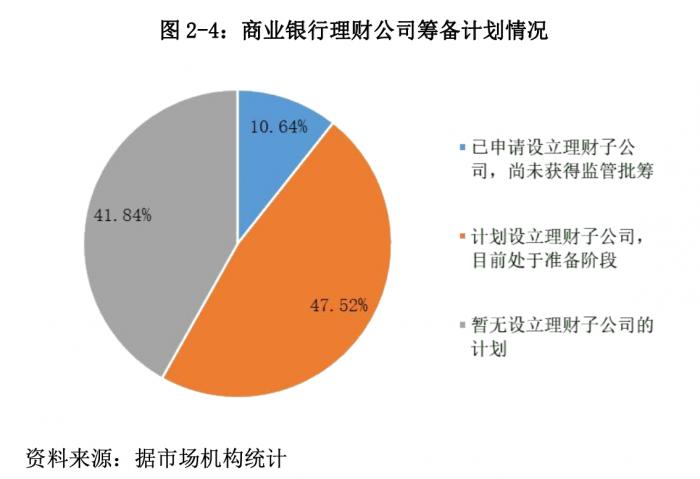 《报告》对目前141家暂未设立理财公司的商业银行调研显示,有10.64%的商业银行已经申请设立理财公司,正在等待监管批复;另有47.52%的商业银行有计划设立理财公司,目前正在准备筹建,具有理财公司筹建动态的商业银行合计占比58.16%,趋近六成。