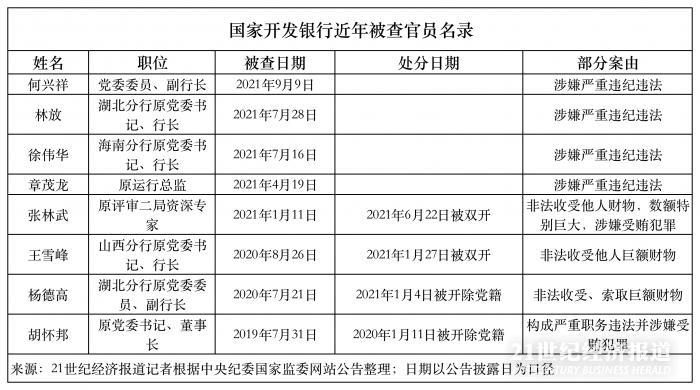 21世纪经济报道记者梳理中央纪委国家监委网站公告发现,国开行原党委书记、董事长胡怀邦于2019年7月底被查的近两年来,国开行已有8位领导干部被查(含胡怀邦),其余6位为:湖北分行原党委委员、副行长杨德高;山西分行原党委书记、行长王雪峰;原评审二局资深专家张林武;原运行总监章茂龙;海南分行原党委书记、行长徐伟华;湖北分行原党委书记、行长林放。