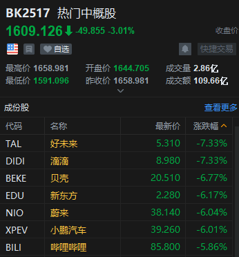 哔哩哔哩跌5.86%,网易跌5.17%,京东跌1.81%,微博跌1.02%,拼多多跌2.80%,百度跌2.40%,阿里巴巴跌2.54%,腾讯音乐跌3.89%,爱奇艺跌5.60%,新东方跌6.17%,贝壳跌6.77%,好未来跌7.33%,滴滴跌7.33%。