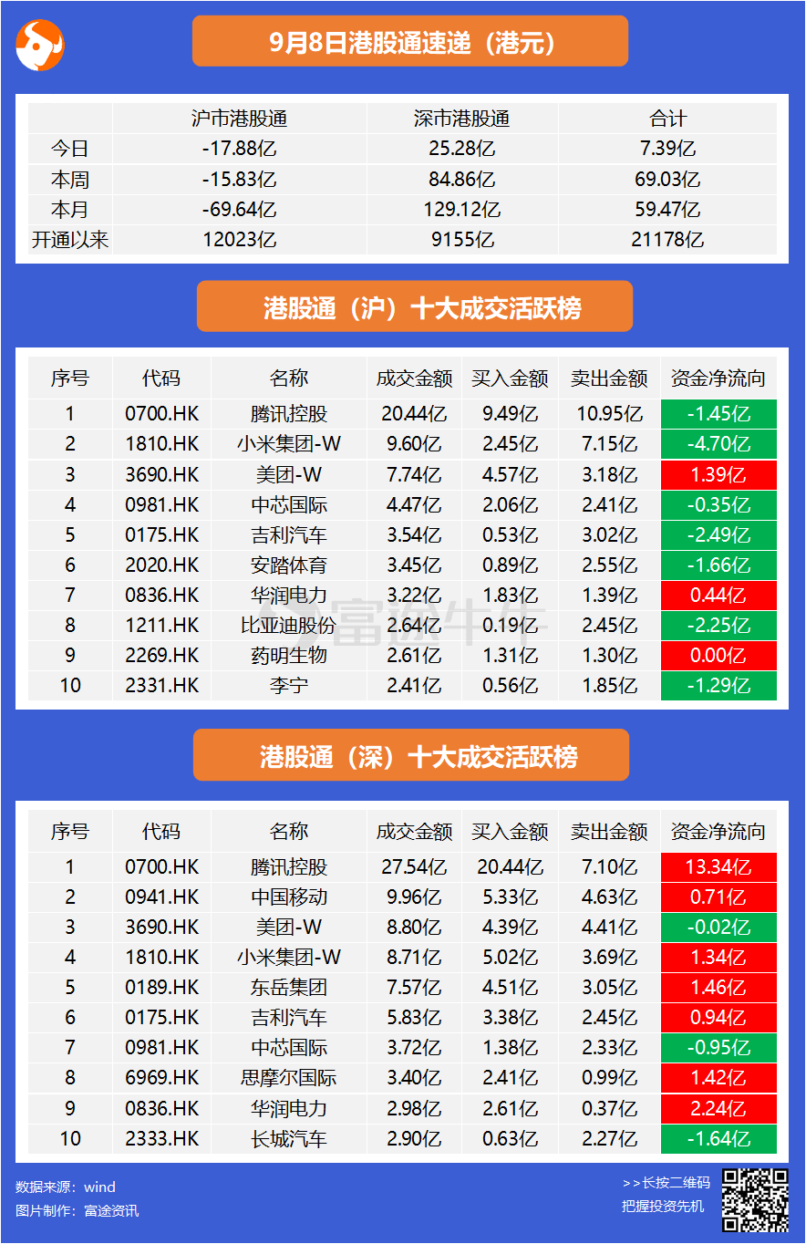 南向资金昨日净买入7.39亿港元。腾讯控股、华润电力、东岳集团分别获净买入11.88亿港元、2.68亿港元、1.46亿港元。小米集团-W净卖出额居首,金额为3.36亿港元。