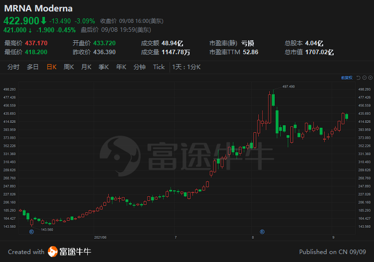 Moderna收跌3.1%,分析师下调目标价至336美元