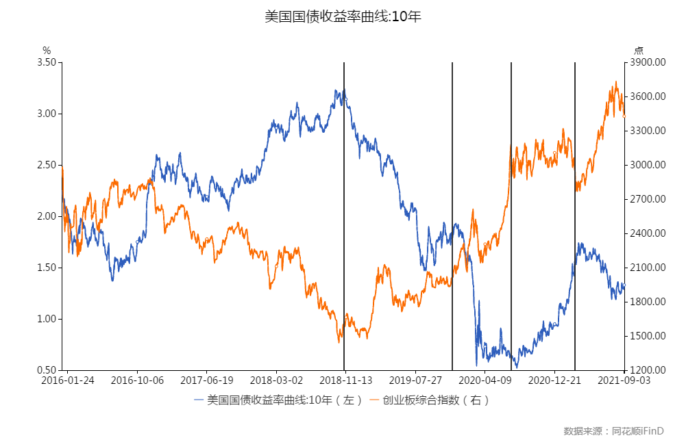 创业板指数主要是由成长股组成,成长股的现金流体现在未来,成长股的现值要用未来的现金流以一定的贴现率进行贴现回来,这个贴现率一般是用10年期国债无风险利率+通胀补偿。