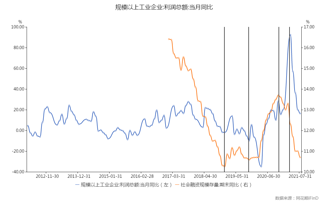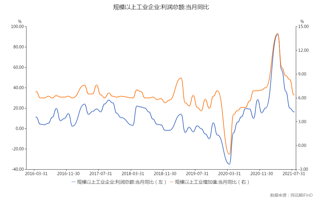 首先,我们来看看经济数据,规模以上工业增加值增速从今年3月份高位的14.10%连续4个月回落至7月份的6.4%。规模以上工业企业利润同样也是连续四个月下滑。