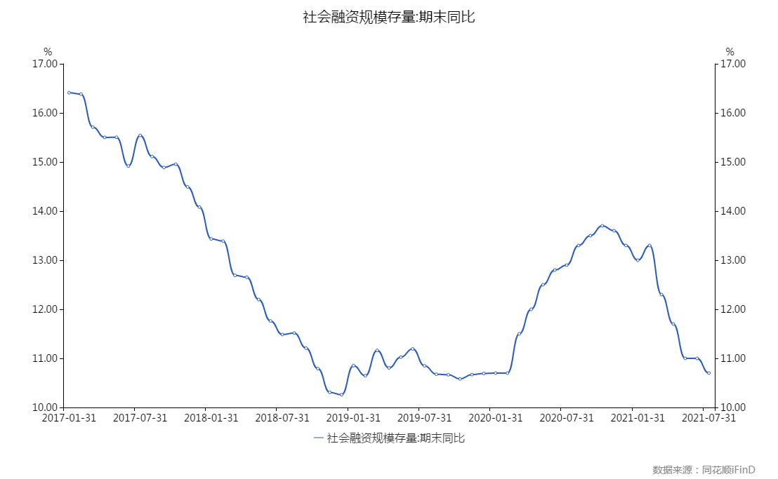 我们观察到社融增速从2020年10月份开始见顶回落,随后2021年3月,经济增速就开始见顶回落。2021年7月份的存量社融增速又回到了2020年初新冠疫情时期的水平,社融增速存在触底反弹的可能性。而最近水泥、基建板块频频异动,也是从侧面反映出经济稳增长的措施出台的预期。我们需要观察社融增速能否见底回升,也就意味着经济增速见底回升。