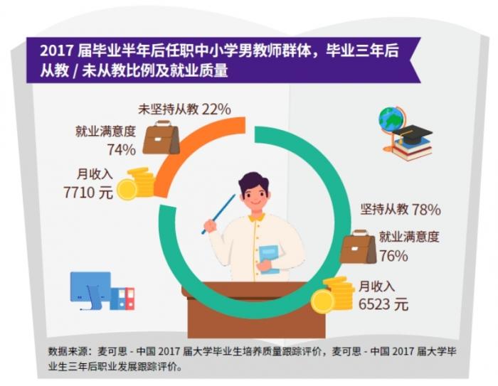 数据显示,坚持从教男教师群体就业满意度达到76%,不仅高于离开教师岗位群体(74%),与全国本科平均水平(71%)相比更是高出5个百分点。