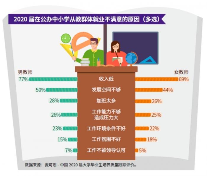 哪些原因可能导致中小学教师岗位对男教师吸引力不足?近日,麦可思研究院研究发现,2020届毕业后在公办中小学当老师的男生中,约3/4对就业现状满意,“收入低”(77%)是他们对就业不满意的最主要原因。