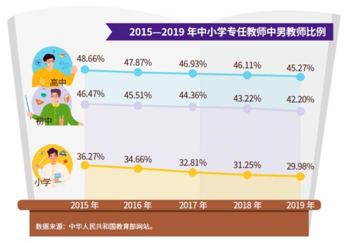 不只是学生,教师队伍也应该增加一丝阳刚之气。根据教育部公布的统计数据,2020年我国小学、初中和高中男教师的比例较20年前累计降低了近20多个百分点。