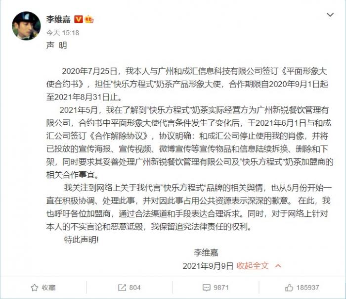 9月9日下午4点,李维嘉在微博发布声明,表示与“快乐方程式”的代言合同至今年8月31日已中止。李维嘉在声明中称,在今年5月了解到“快乐方程式”实际经营方为广州新锐餐饮管理有限公司而非签约方广州和成汇信息科技有限公司后,于6月1日签署了《合作解除协议》,并在协议中要求对方妥善解决奶茶加盟商合作事项。声明中,李维嘉表示,自己从5月份起一直在积极协调、处理此事,并呼吁加盟商通过合法渠道和手段表达合理诉求。