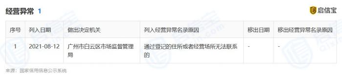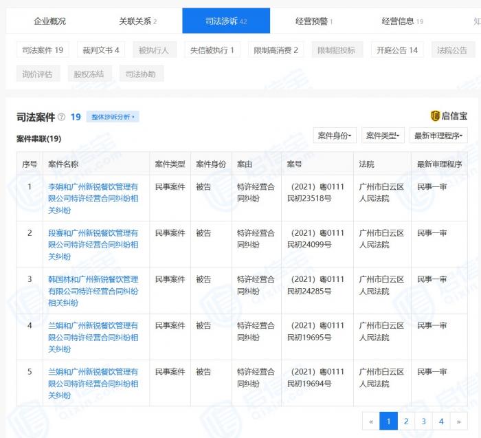 启信宝信息显示,“快乐方程式”实际经营方为广州新锐餐饮管理有限公司,公司在2020年8月14日成立,注册资本100万元,由周成和周金年各持股50%,法定代表人为周金年。今年8月12日,该公司由于通过登记的住所或经营场所无法联系,被广州白云区市场监督管理局列入经营异常名单。同时,该公司今年内多次因特许经营合同纠纷被起诉,目前处于风险状态,并被最高法院列为失信公司以及限制高消费企业。