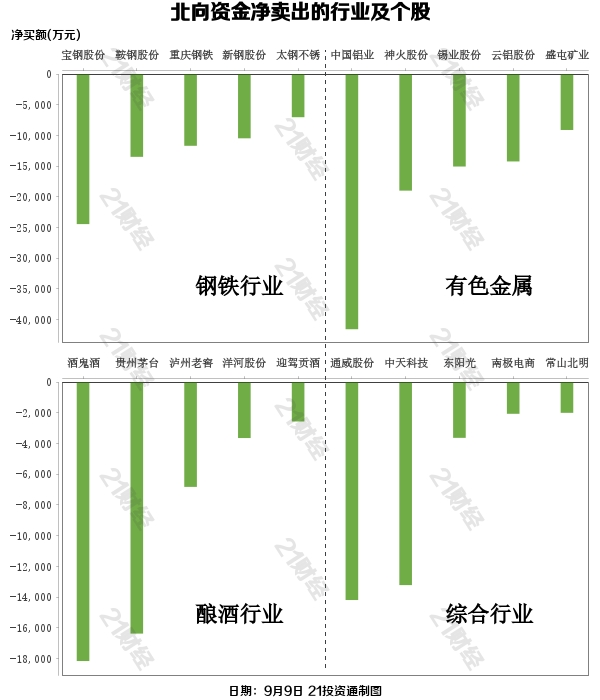 北向资金减持了21个行业,其中钢铁行业最多,净卖出金额达8.08亿元,其次是有色金属行业,净卖出6.56亿元。